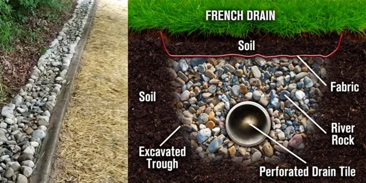 A perforated drainage pipe is laid along the trench and wrapped in fabric to prevent clogging from soil and debris.